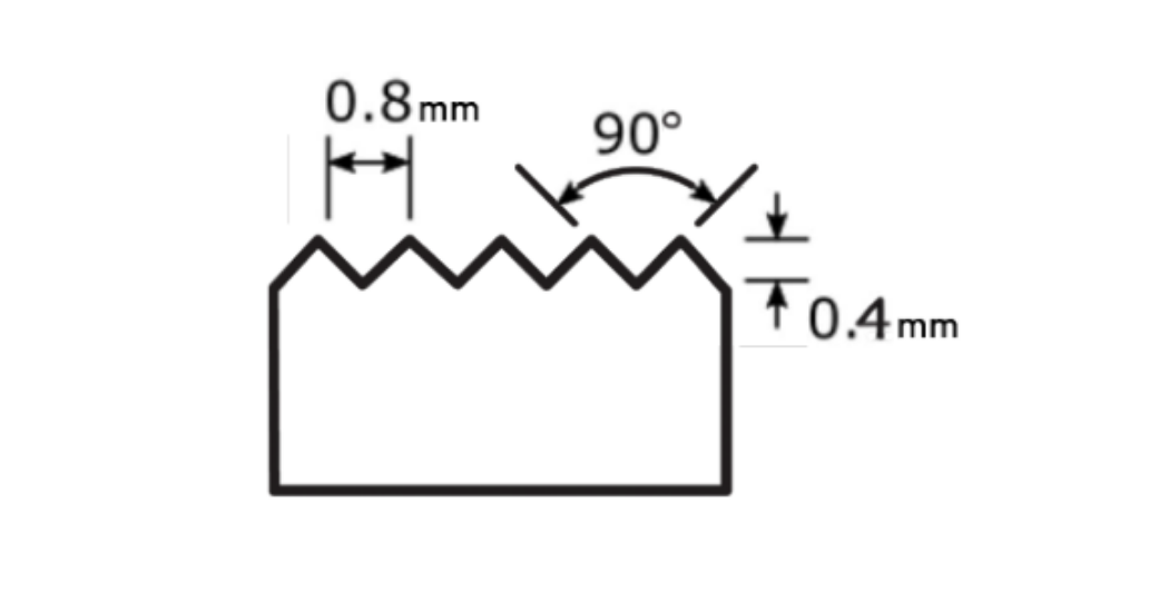 處理 螺旋鋸齒表面處理也是一個(gè)連續(xù)凹槽,類似于標(biāo)準(zhǔn)庫存表面處理,因?yàn)榘疾凼鞘褂?90° 夾角“V”工具生成的。對(duì)于所有尺寸,槽深 1/64”,進(jìn)給深度為 1/32”。