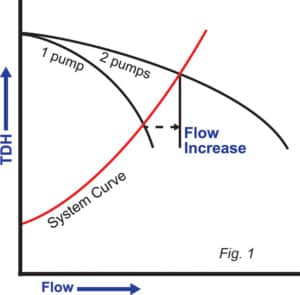在任何給定的總動態(tài)揚(yáng)程 (TDH) 下,并聯(lián)運(yùn)行的兩個相同的泵能夠產(chǎn)生兩倍于單個泵的流量。然而,系統(tǒng)中實(shí)現(xiàn)的實(shí)際流量取決于系統(tǒng)曲線與泵曲線的交點(diǎn)。除非系統(tǒng)曲線是可變的,否則流量增加可能不會那么顯著。